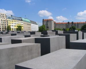 We lopen naar het metrostation Anhalter Bahnhof en nemen de metro een halte verder naar Potsdamer Platz. Vanaf de Potsdamer Platz lopen we richting de Brandenburger Tor. We komen langs een plein met daarop allemaal vierkante zuilen in verschillende hoogten. In de boekjes die we bij ons hebben staat hier niets over vermeld, dus vragen we het aan een chauffeur van een fietstaxi. Hij verteld dat dit een monument is dat gemaakt is voor de Joden. Als we later thuis komen blijkt dat dit pas een week geleden geopend is, vandaar dat het niet in de boekjes staat!