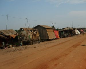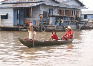 Nadat we ons opgefrist hebben, gaan we naar de floating villages op het Tonlé Sap meer. We gaan per tuktuk. Het eerste stuk rijden we op een verharde weg, maar al gauw gaat dat over op een zandweg. Verschillende auto’s en busjes halen ons in, zodat het stof opwaait en we moeten vaak een hand voor onze mond houden om geen stof te happen. Dit is het echte Cambodja!