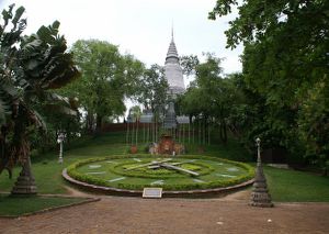 Nadat we dit gezien hebben gaan we naar Wat Phnom. Dit is een mooie tempel met een grote klok die ervoor in het gras ligt. In de bomen rond de ze tempel zitten vele apen te slapen en er zijn er verschillende op het gras aan het spelen.