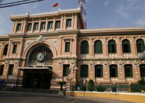 Om 10.00 uur gaan we met de taxi die het hotel geregeld heeft naar de luchthaven van Phnom Penh. De taxi kost ca. USD 10. Om 12.40 uur vliegen we naar Ho Chi Minh in Vietnam. We hebben ruim een uur vertraging en komen pas om 14.40 uur aan in Ho Chi Minh. Gelukkig heeft onze gids nog staan wachten. Op weg naar het hotel stoppen we bij de kathedraal Notre Dame. Daar tegenover ligt het postkantoor. Dit zijn beide erg mooie gebouwen van Franse architectuur. Daarna gaan we naar het Riverside hotel om in te checken en ons op te frissen.